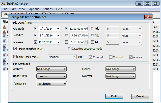 BulkFileChanger is a small utility that allows you to create files list from multiple folders, and then make some action on theModify their created/modified/accessed time, change their file attribute (Read Only, Hidden, System), run an executable with these files as parameter, and copy/cut paste into Explorer.