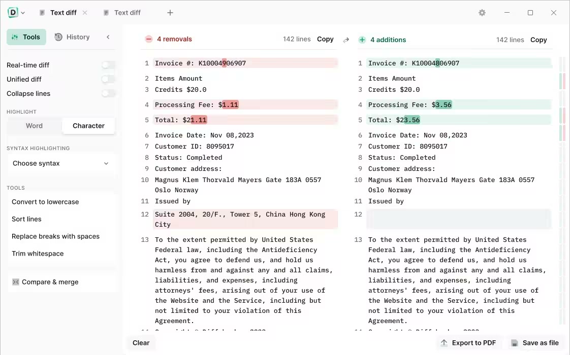 Download files in the Diffchecker format or export them as a PDF in one click