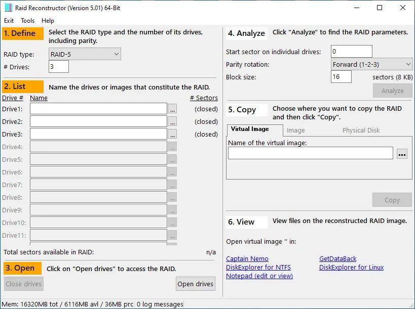 RAID Reconstructor de-stripes broken RAID-0 and RAID-5 arrays, consisting of 2 to 16, or 3 to 16 drives, respectively. RAID-5 arrays are allowed to have one drive missing.